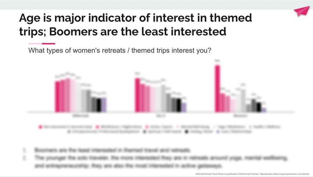 - Solo female travelers interest in retreats and small group trips as well as what kind of trips they are most keen on. The data is broken down by age and demography.