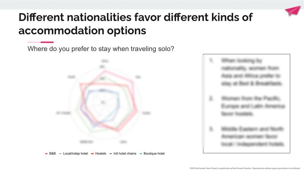 - Choice of accommodation for women traveling solo, with particular deep-dives into differences by age, income and geography.