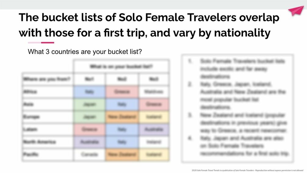 - Bucket list destinations of solo female travelers, by age and by nationality.
