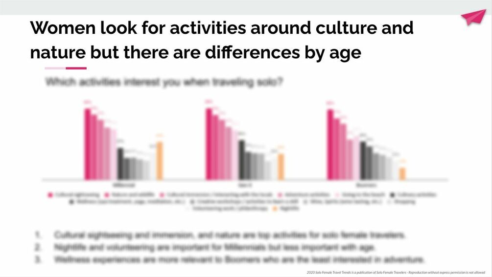 - The activities that solo female travelers like to engage in when on a trip and the differences by age group and nationality.